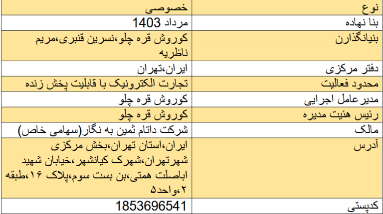 مردادماه ۱۴۰۳ یک تیم ۳ نفره به رهبری کوروش قره چلو بعد از چندین ماه تحقیق،تفکر،تدبر به این نتیجه رسیدند که در کشور عزیزمان ایران و بسیاری از کشورهای دنیا توجه کمرنگی به تولیدکنندگان کالا و مشاغل خدماتی میشود،چه از طرف دولت و چه از طرف تمامی فروشگاه ها(اینترنتی و حضوری)،در راستای اجحاف نشدن حق تمامی مشاغل(خصوصی و دولتی)اعم از تولیدکنندگان،خرده فروشان،عمده فروشان،بازرگانان،خدماتی ها و.....این گروه ۳ نفره شرکتی بنام داتام ثمین به نگار(سهامی خاص)به شماره ثبتی ۶۳۶۳۰۱ وشناسه ملی ۱۴۰۱۳۶۴۶۷۱۴ مورخ ۱۴۰۳٫۰۵٫۲۳ نهادند.شرکت نامبرده تازه تاسیس ابتدا کار خود را در آپارتمانی کوچک در تهران شروع کرد.اصلی ترین کارکرد این شرکت برای رسیدن به اهداف خود(خرید،فروش،لجستیک و خدمات اینترنتی با قابلیت پخش زنده از کالا و خدمات تمامی مشاغل)مسیری شفاف و روشن بین تمامی مشاغل و مصرف کننده یا بازدیدکننده است.